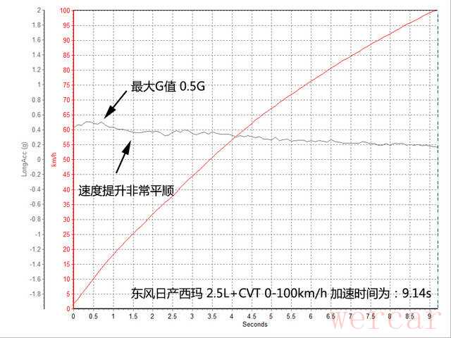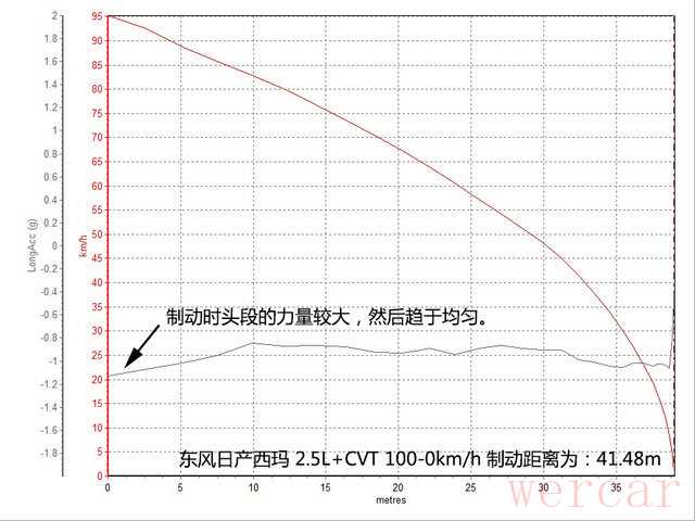 即使关闭车身稳定系统后,车辆的起步姿态也非常柔和,CVT变速箱虽然不能提供强力的推背感,但速度提非常平顺。前悬架也能很好的控制住车辆的姿态。最终的加速成绩为9.14s,而刹车时还是会有轻微的点头现象,但制动成绩的还是非常稳定的,最终距离为41.48m。