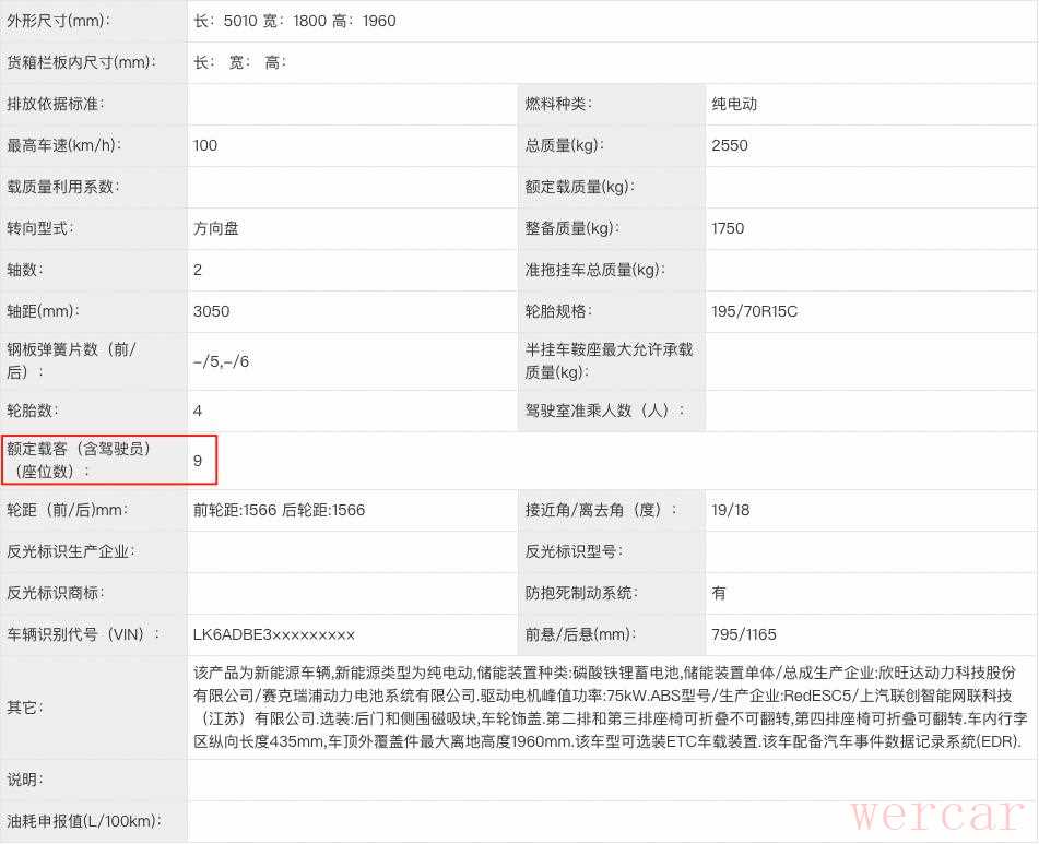 五菱扬光纯电版9座客车版部分参数信息