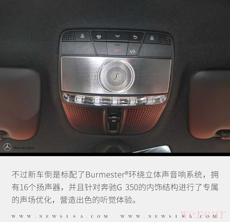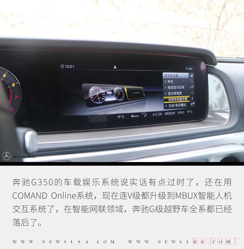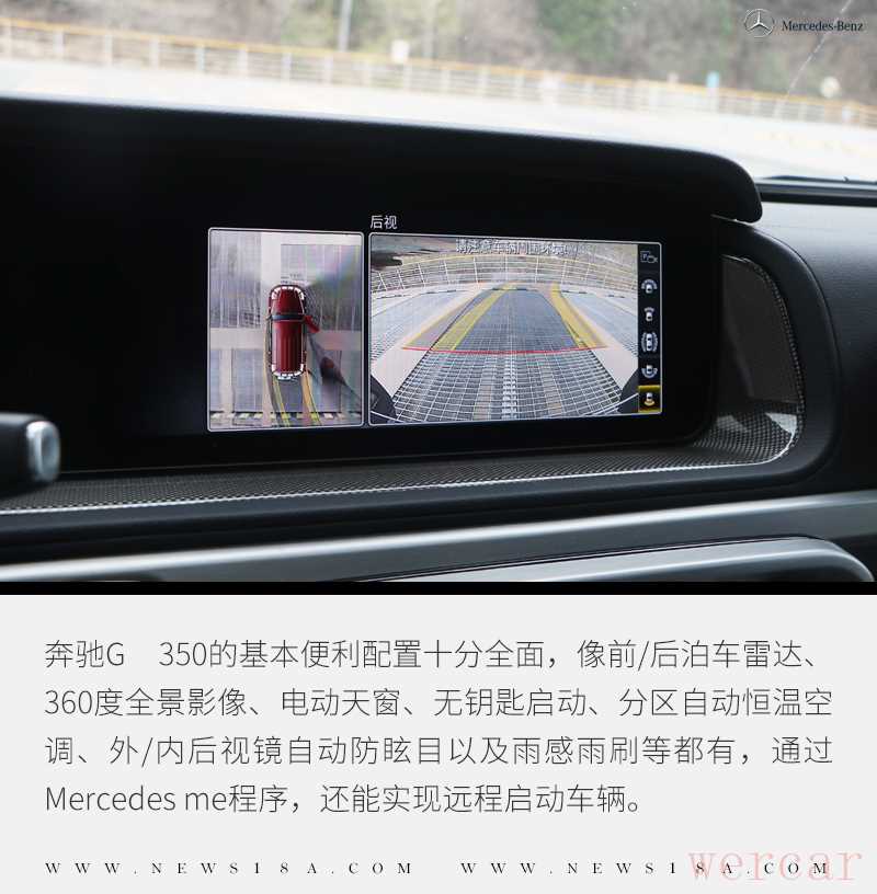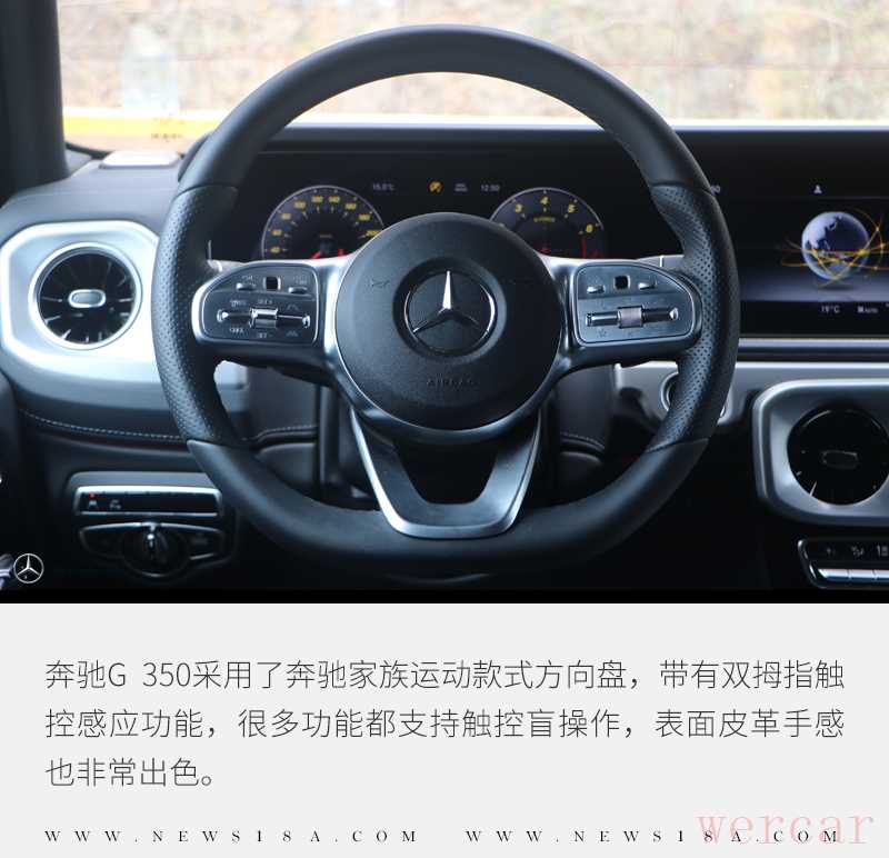 奔驰G 350的配置水平其实并不低,相比奔驰G 500只是少了主动式多仿形座椅组件,影响并不大,可以说除了COMAND Online系统相对差点意思以外,奔驰G 350的功能配置表现绝对对得起自己的价位。