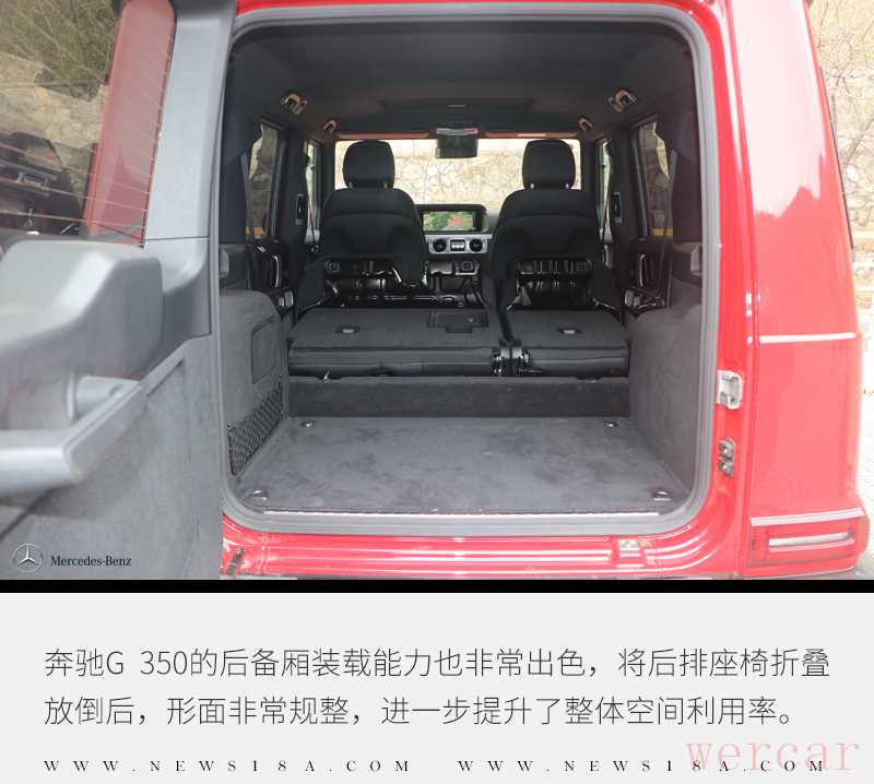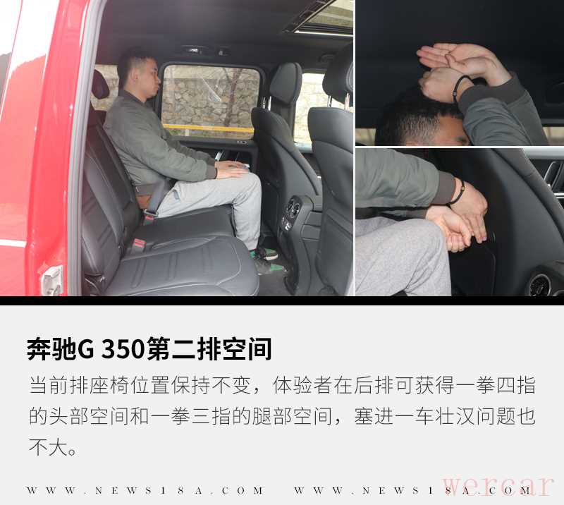 从车身尺寸来定位的话,奔驰G 350属于标准的中大型越野车了,车内空间还是能够保证的,另外新车的储物空间也足够丰富。