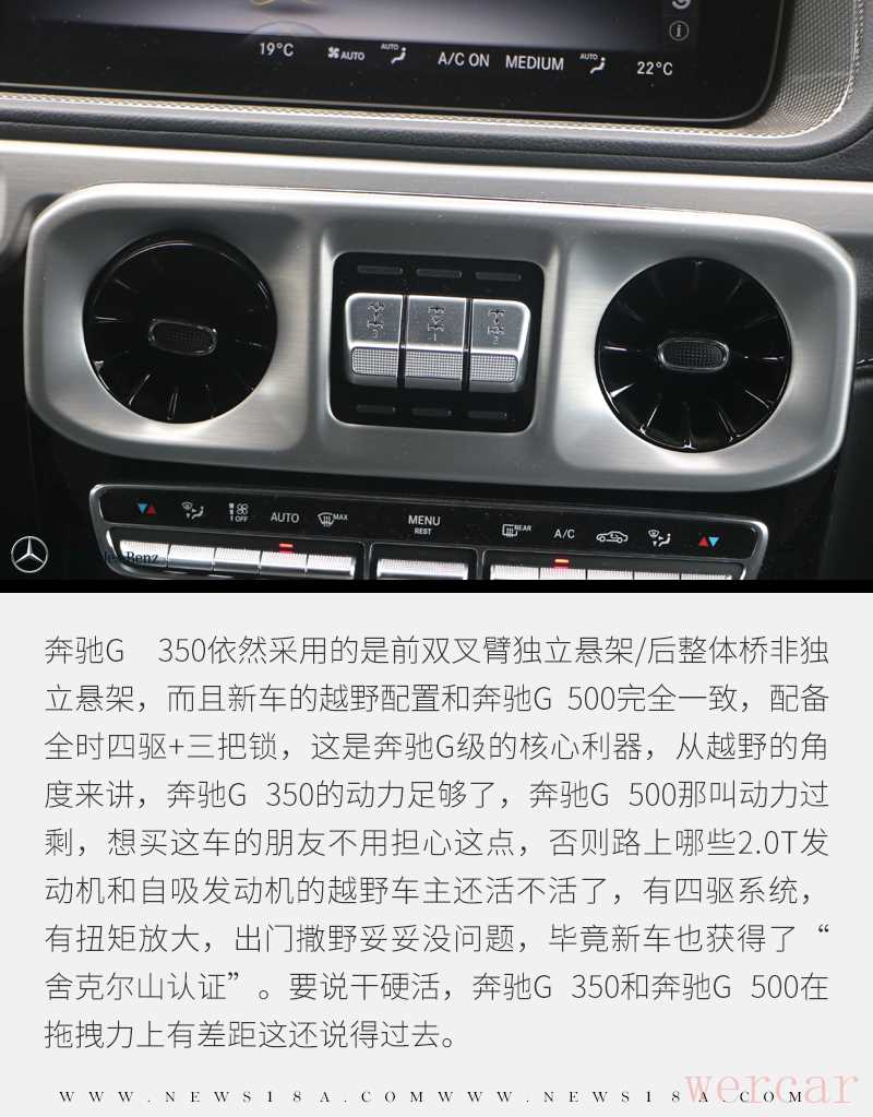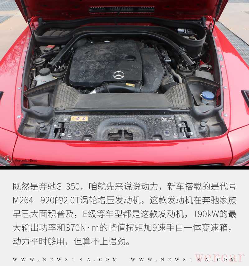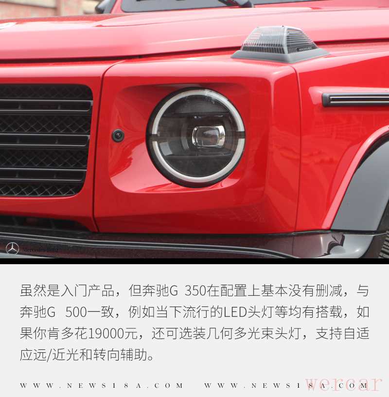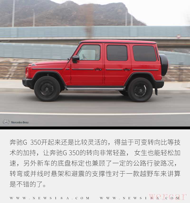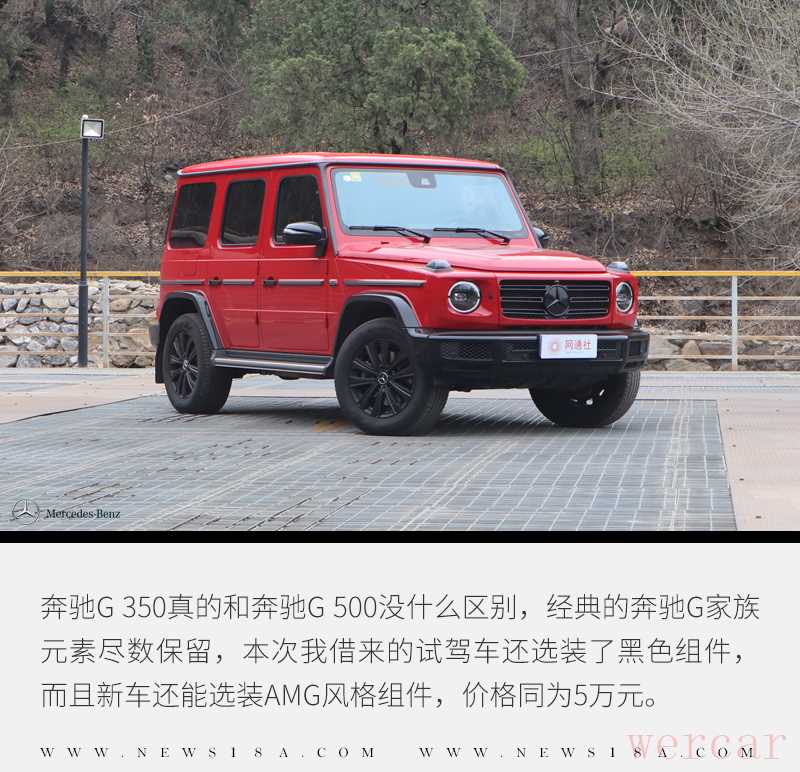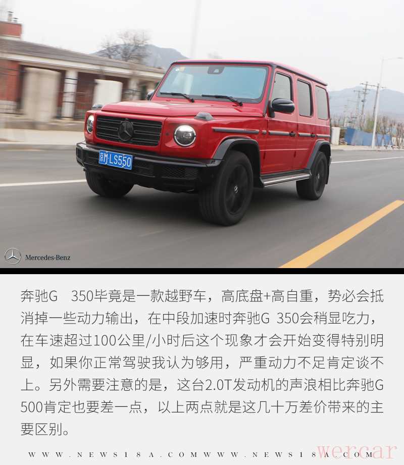其实对于想买奔驰G 350的朋友来讲,你唯一需要降低要求的就是奔驰G 350的动力系统,这种差异体验更多的是在市区低速行驶时,你需要给更深的油门才能获得想要的动力体验,另外一个就是声浪,毕竟你不能要求一台2.0T发动机和4.0T双涡轮增压V8发动机比声浪,这是你少花几十万带来的最明显的体验差异了。至于新车的越野表现,你真的不用担心,2.0T发动机+全时四驱+三把锁带来的越野性能依然是一流的。