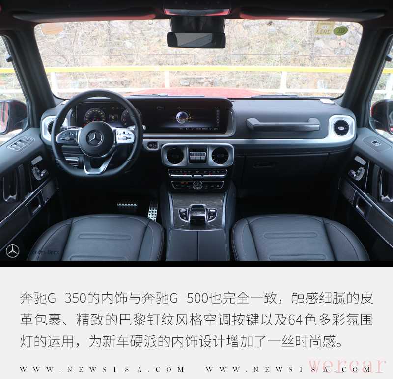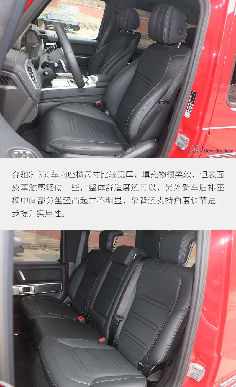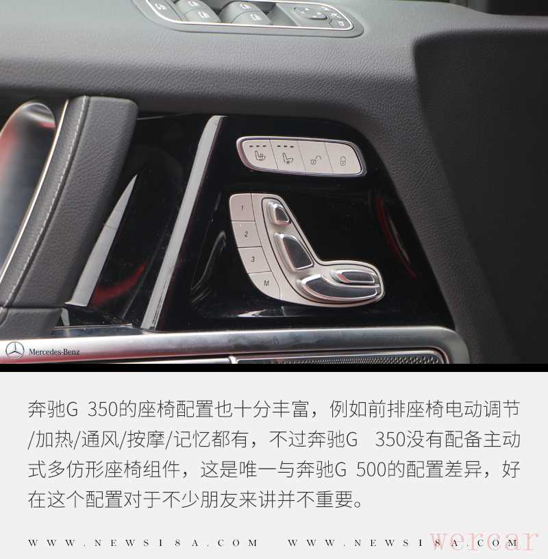 在外观设计和内饰材质方面,奔驰G 350和奔驰G 500的表现基本一致,能分出区别的就是车尾的G 350铭牌和轮圈了,在整体产品质感体验上,奔驰G 350并没有打折扣。