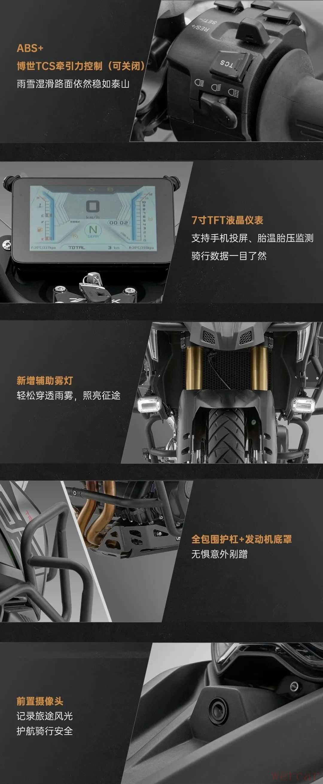 7英寸TFT全彩仪表盘是TRK702的科技核心,支持手机投屏、导航投屏、胎压胎温监测及AI语音助手“小Q”,骑行者可实时查看导航信息。全LED照明系统、前置摄像头与辅助雾灯的组合,大幅提升了夜间与恶劣天气下的行车安全。