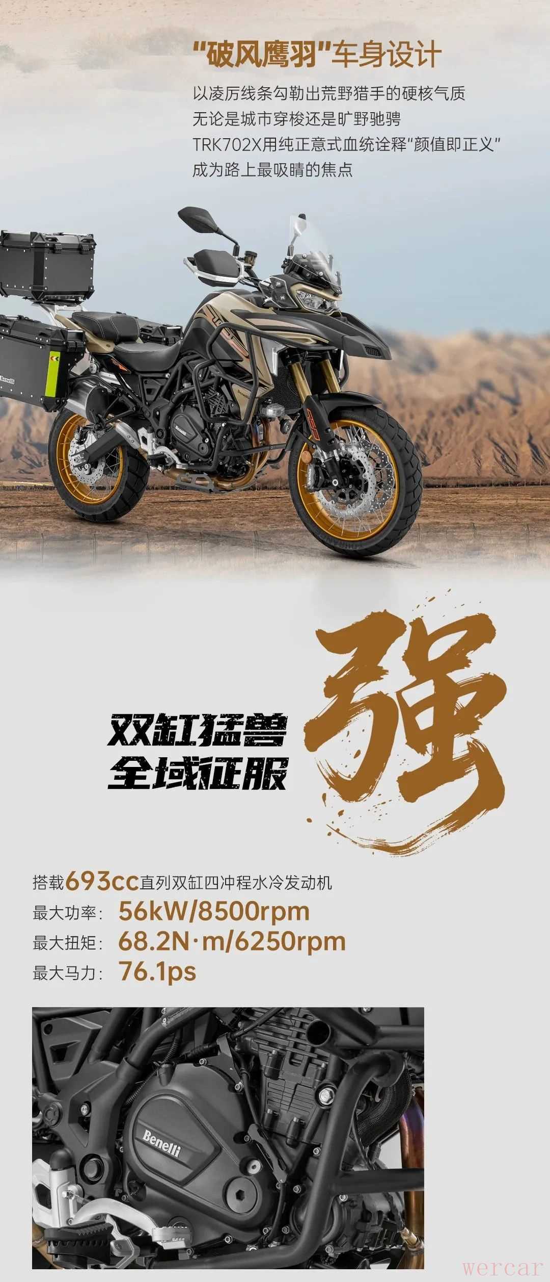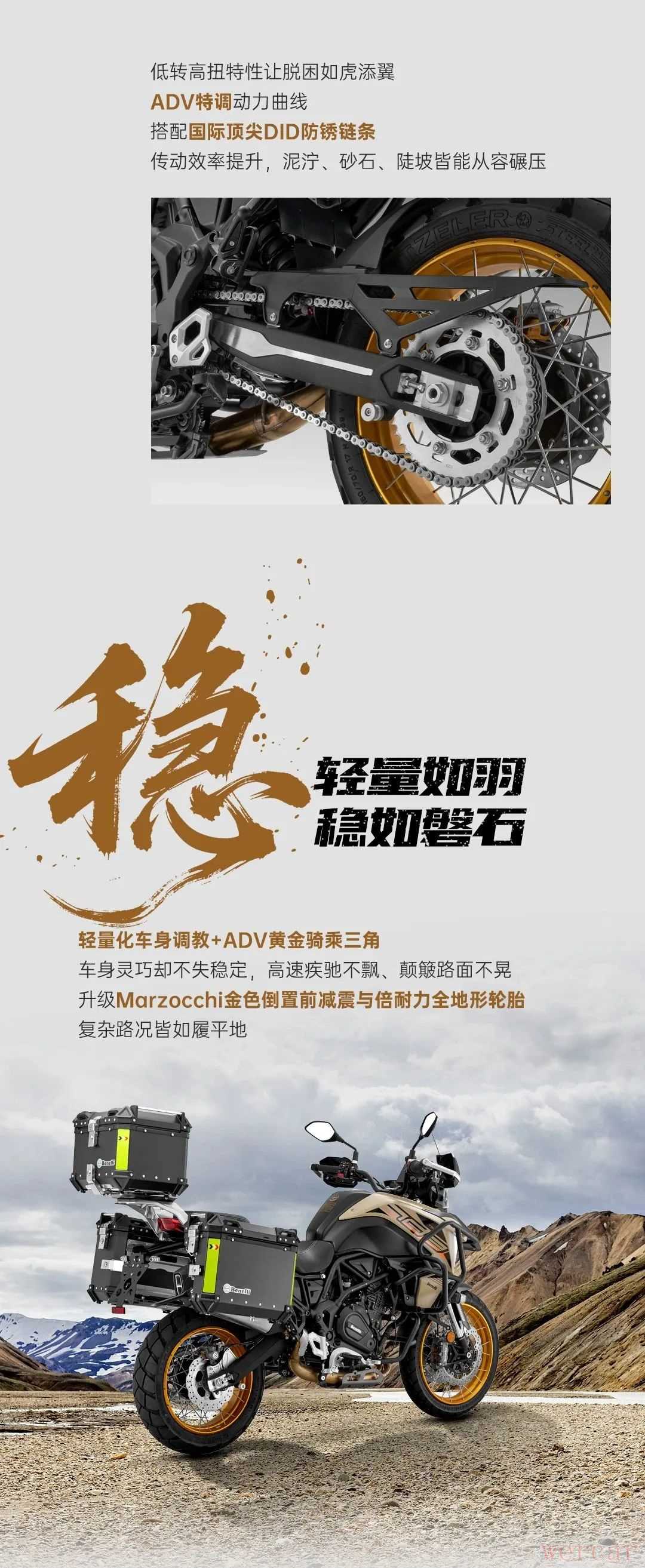 "品牌背书:" 贝纳利是意大利著名的摩托车制造商,以其在复古旅行车(TRK)和探险车(ADV)领域的造诣而闻名。