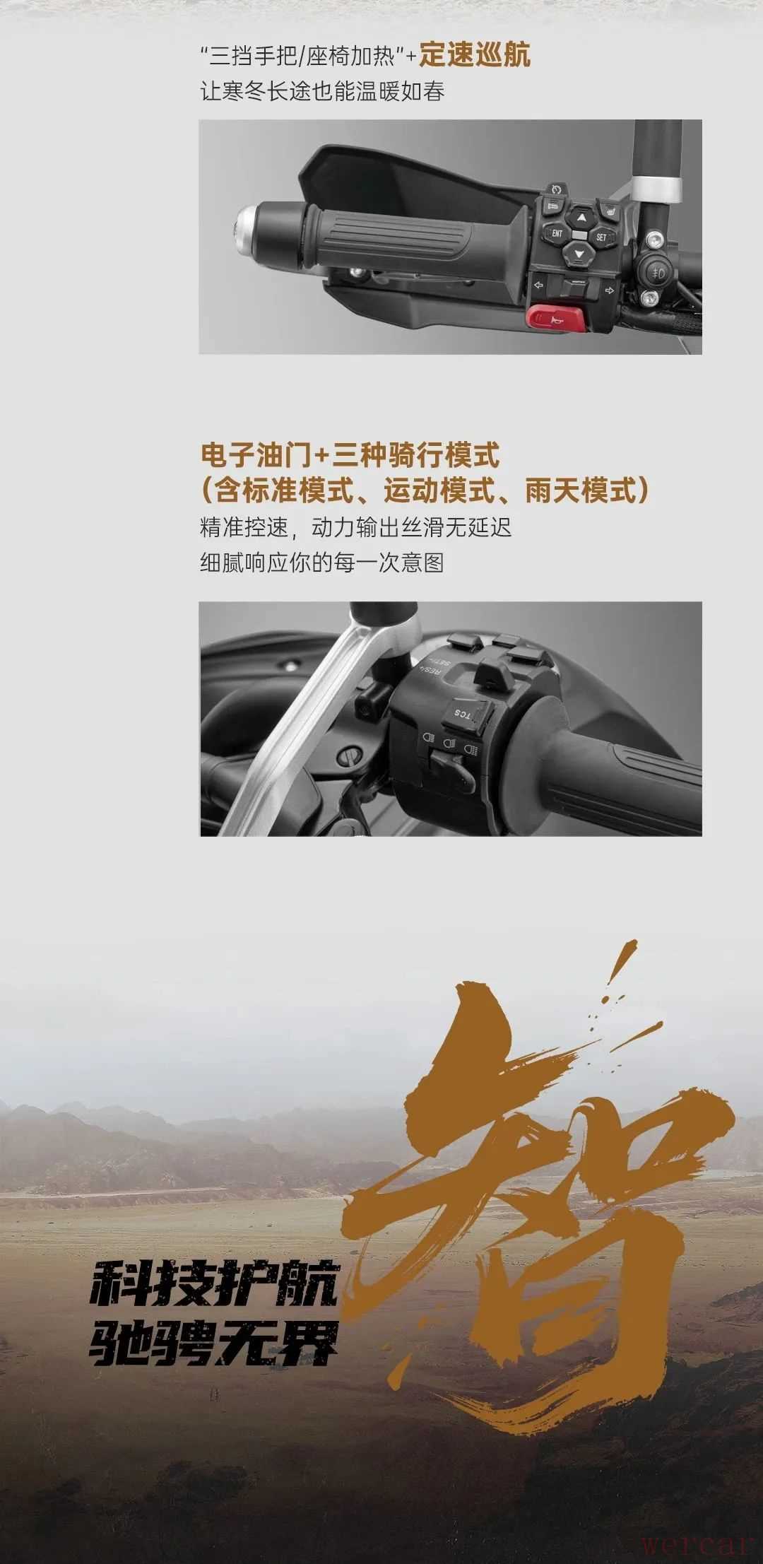 安全配置方面,博世双通道ABS+可关闭TCS牵引力控制系统成为标配,Brembo对向四活塞卡钳搭配SUNSTAR浮动碟盘。新增的定速巡航功能,则让长途摩旅的疲劳感大幅降低。三挡可调加热手把与加热坐垫,让零下环境骑行温暖如春。