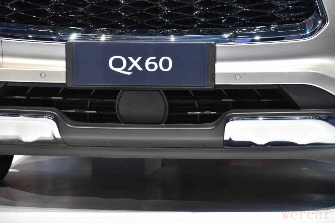 全新英菲尼迪QX60的车头下半部分采用带有镀铬贴片的黑色塑料包围,兼顾精致以及SUV的野性,此外牌照架下方还设置有毫米波雷达探头。