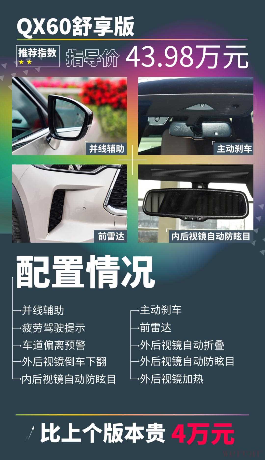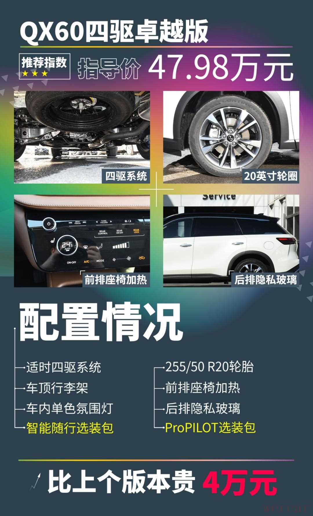 此外,顶配车型还提供了前排座椅按摩、HUD抬头显示、车载空气净化器、后排座椅电动放倒等配置,在细节上的提升更明显。不过考虑到车辆的指导价已经接近62万元,与最低配车型的差价超过了20万。而除了配置、材质、细节的提升外,在动力方面并没有区别。因此,顶配的QX60其实并不适合大部分人购买,我们也只能给出1颗星的推荐指数了。