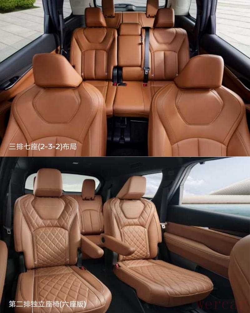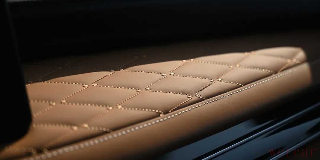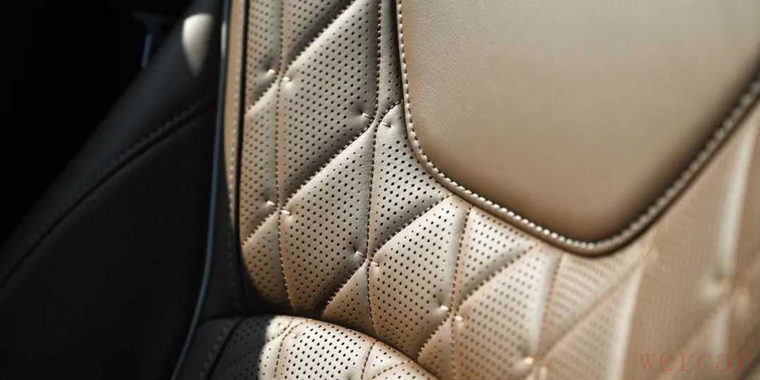 首先,整车座椅不再是普通的真皮材质,而是升级成了更高档、一些百万级豪车才会使用的半苯胺高级真皮材质,触感更柔软,质地更细腻,并且座椅还采用了大面积的菱形缝线以及包边工艺。同时,车辆连带着中控台、门板等区域也采用了菱形缝线设计,更有豪华感。