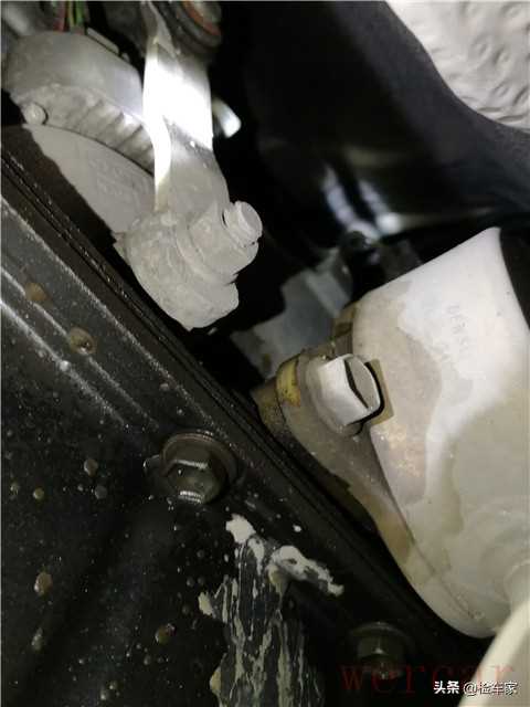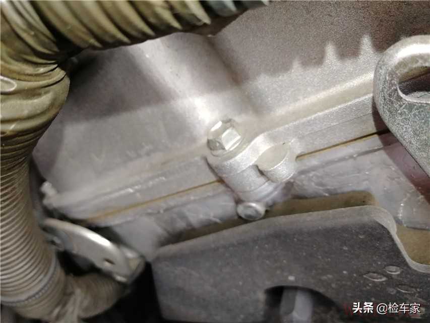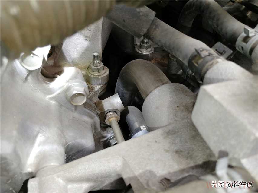 发动机的机脚垫螺丝也是原封未动,基本上不可能分解维修发动机了。但是旁边的机油尺套管有轻微的油液渗漏。