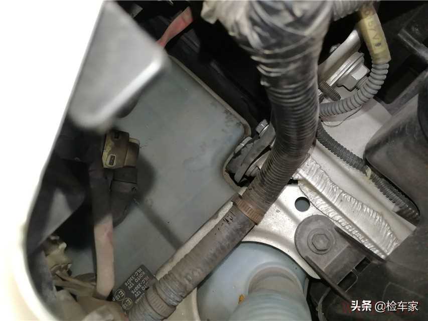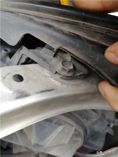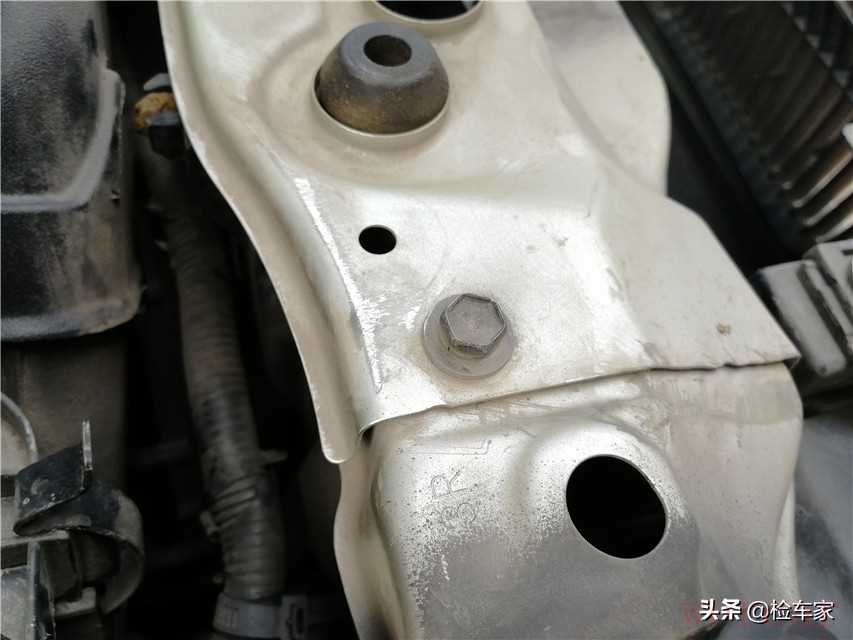透过一个小缝隙观察到了前防撞梁的固定螺丝,没有拆卸,说明前部的碰撞事故并不严重。