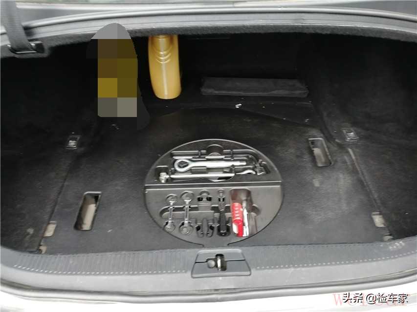 打开后备箱,表面灰尘有点多,没有异味和泥沙,随车工具齐整,综合以上几点排除了车辆泡水的嫌疑。
