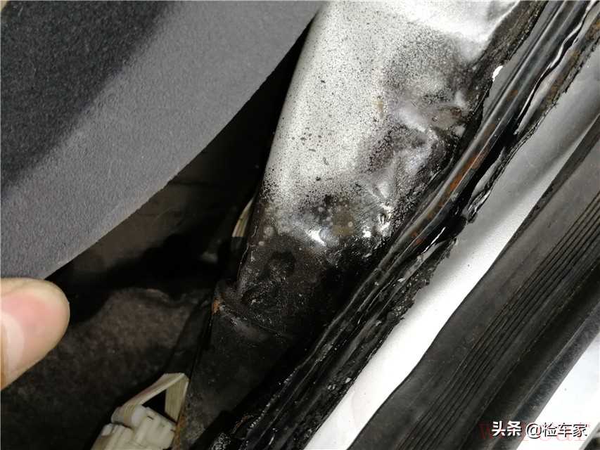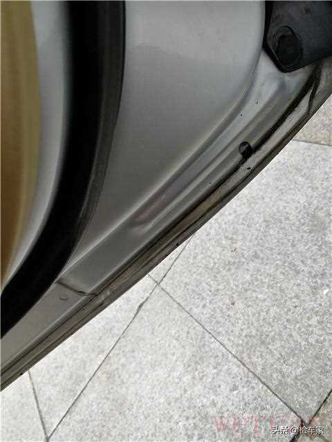 看到后备箱边缘胶条的形状有点不规整,二鹏我觉得这不太正常,扒开后备箱边缘胶条发现两侧后围板上部都有明显的二次喷漆痕迹,后围板中部整体内凹,两侧都有未完全修复的痕迹;这种情况说明车辆后部有过相对严重的追尾事故。