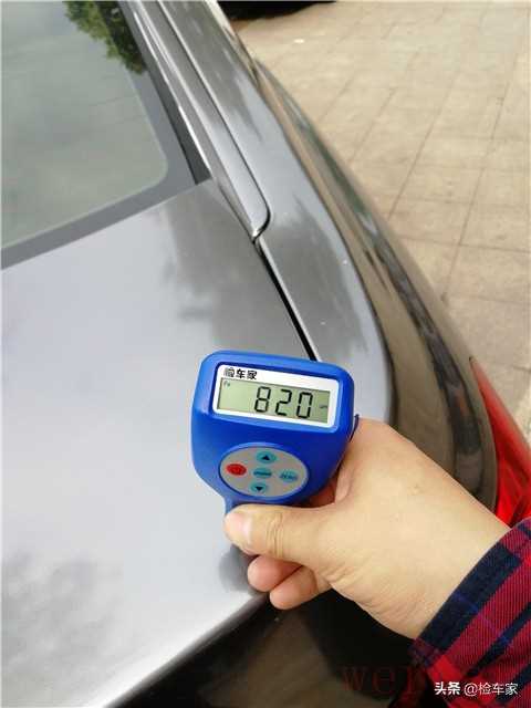 后备箱盖的漆面数值高达820微米,明显是经过钣金修复的,位置是在靠右后的位置,初步判定此车右后部是有过撞击的。