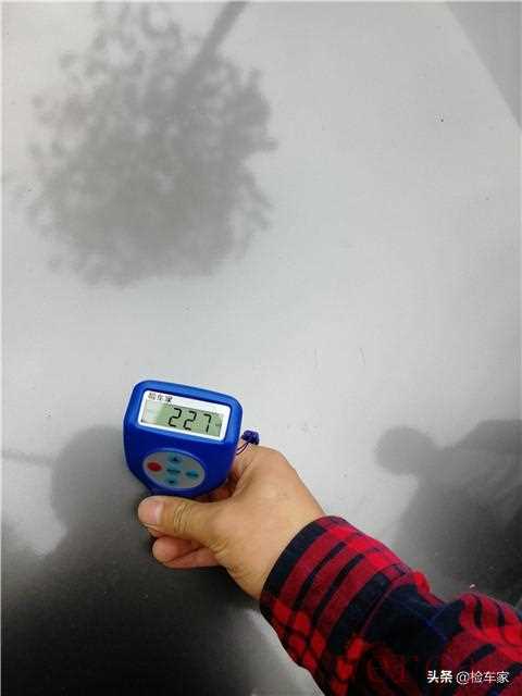 因为贴了膜,这台车的漆面就是原车漆加上车膜的厚度,正常的数值应该在320微米上下,机盖的漆面只有227微米,偏低了。根据我的经验,机盖有可能更换过。因为4S店的喷漆比原厂少了一道工序,漆面厚度会薄一点儿。
