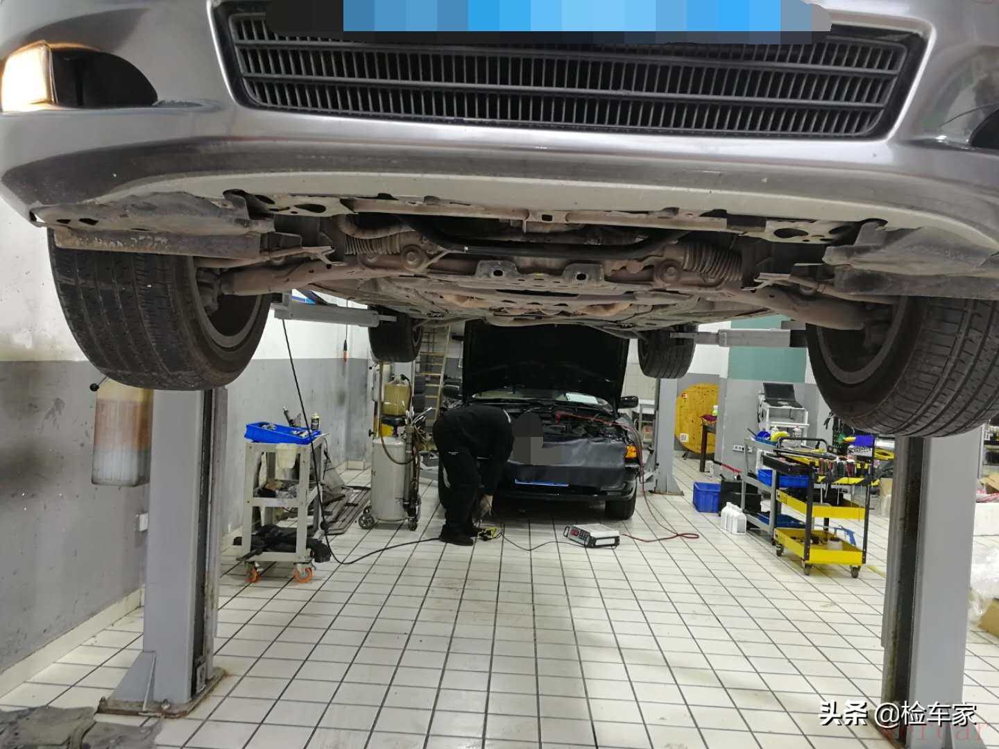 顺路开到了附近的修理厂进行底盘检测,把车子高高的举起来,还是能看到明显的使用痕迹,有些地方还有轻微的托底但是并不是特别严重。