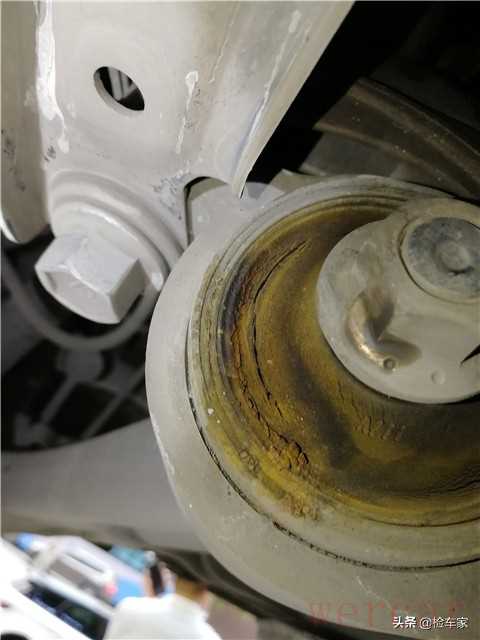 两前下支臂胶套都有轻微的开裂,但是下支臂固定螺丝没有拆卸,没有更换过,长时间的老化导致橡胶有一些裂纹也是正常现象。