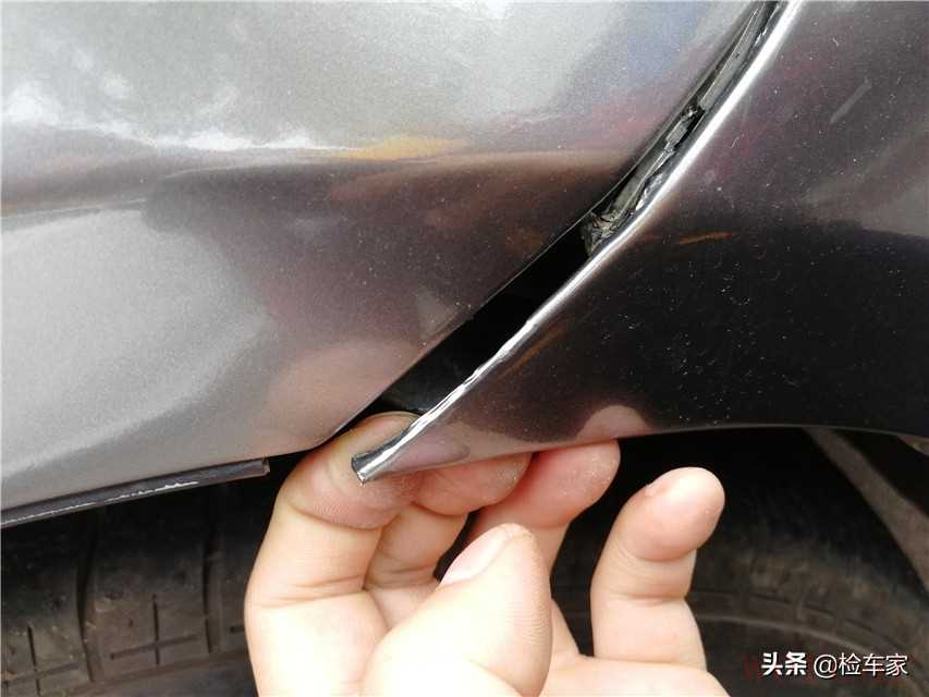 前保险杠与叶子板连接处没有安装到位,前杠内侧的挂卡也已经破损,轻轻一抠就可以掰开,二鹏我估计前保险杠是更换过的。