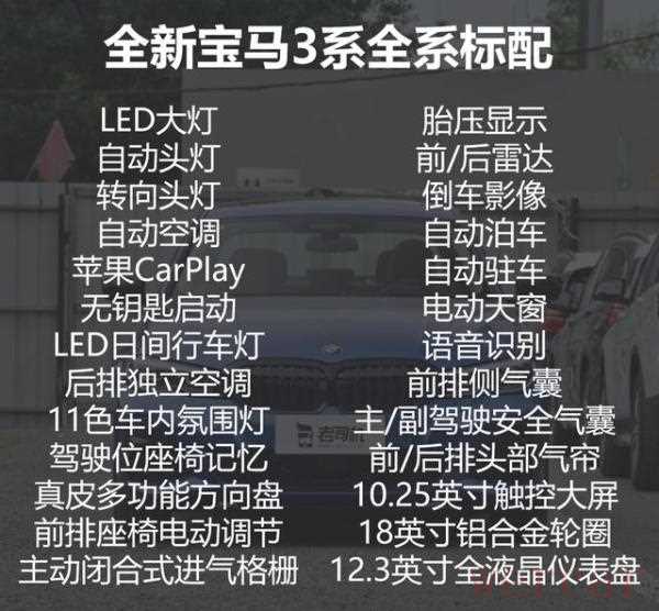 全新一代宝马3系的整体配置水平相当不错。全系标配12.3英寸全液晶仪表盘、10.25英寸触控大屏、11色车内氛围灯、LED大灯、LED日间行车灯、后排独立空调、自动泊车、电动天窗等配置,非常厚道。