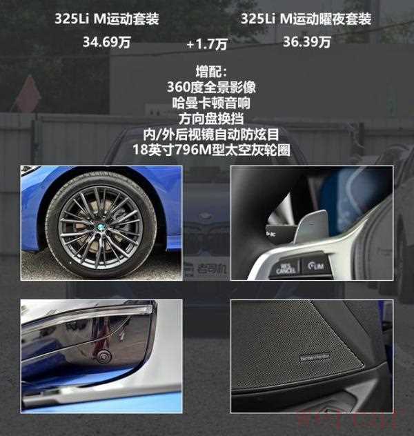 喜欢操控的朋友当然首选短轴版车型,325i M运动套装多花1.6万元即可升级为325i M运动曜夜套装,可谓是颜值与配置双收,其中包含了哈曼卡顿音响、360全景影像、18英寸枪灰色轮圈,换挡拨片等配置。
