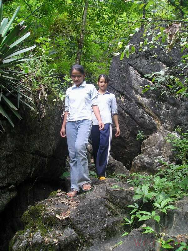 在还没被烈日晒晕之前,我终于到了姐妹俩家。我发现快到他们家时,路就没有了,只能从一些大石头的缝隙里钻过去。那对姐妹就是这样走过来迎接我们的。