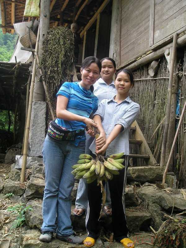 姐妹俩为了招待我,割下了树上的芭蕉。