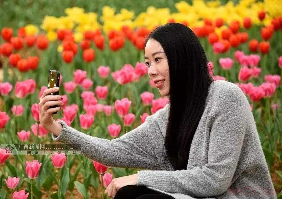 游客在河池市宜州区奇遇双江景区郁金香花海中自拍。(高东风/摄)