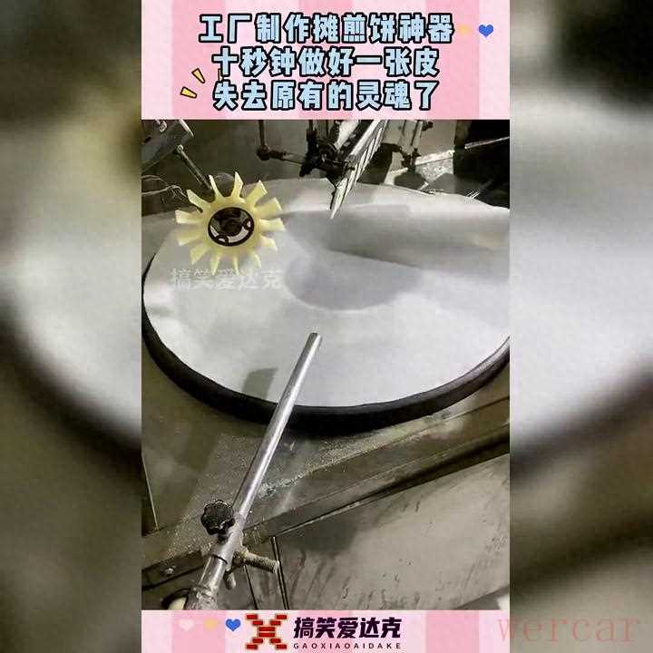 工厂制作摊煎饼神器,十秒钟做好一张皮,失去原有的灵魂了。