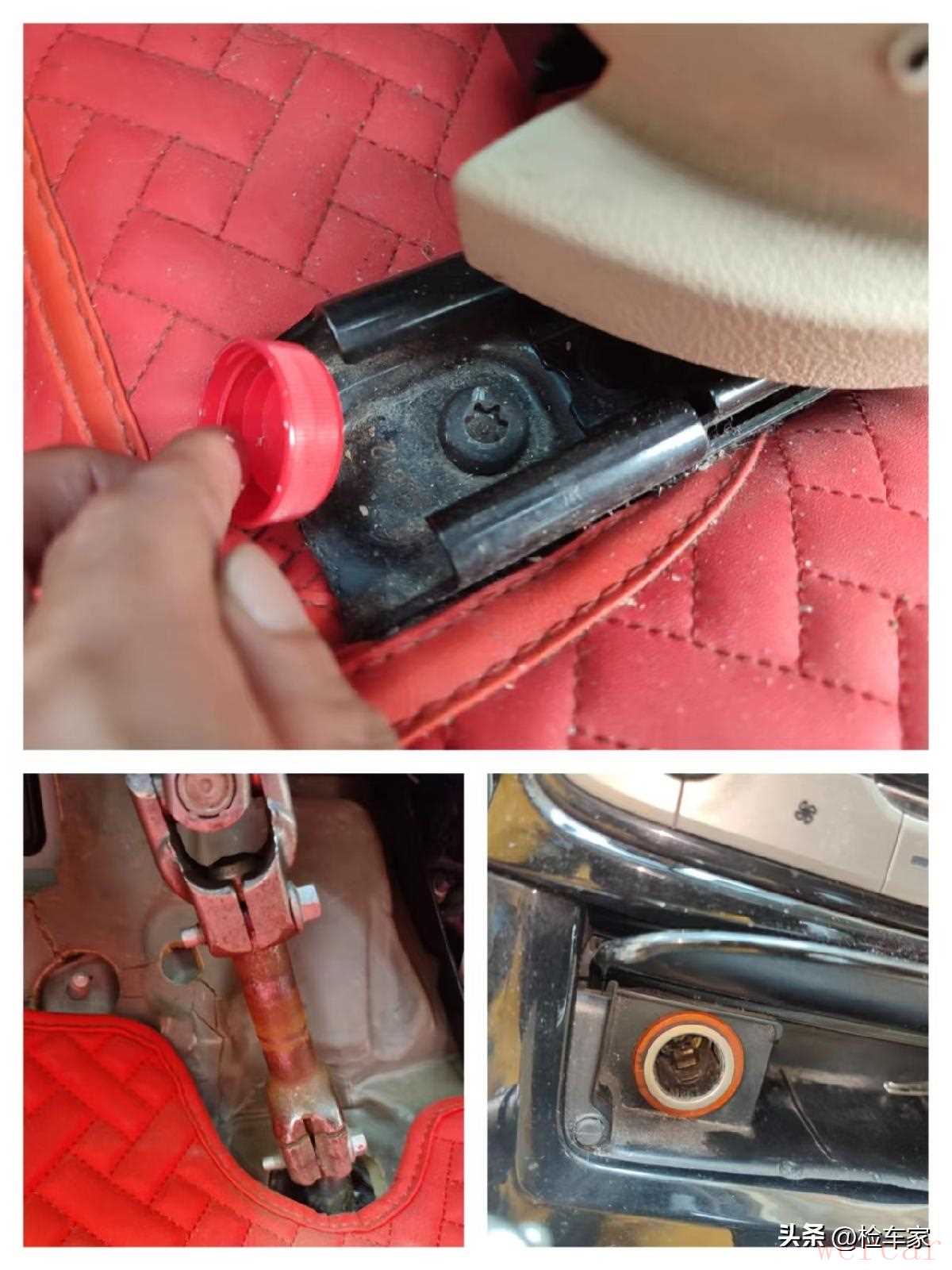 来到内饰方面的检测,可以看到方向管柱光洁如新,没有一点锈蚀痕迹。座椅固定螺丝有拧动拆卸痕迹,滑道也是干净无泥沙。检测其他内饰情况后综合判断是没有水泡的情况。