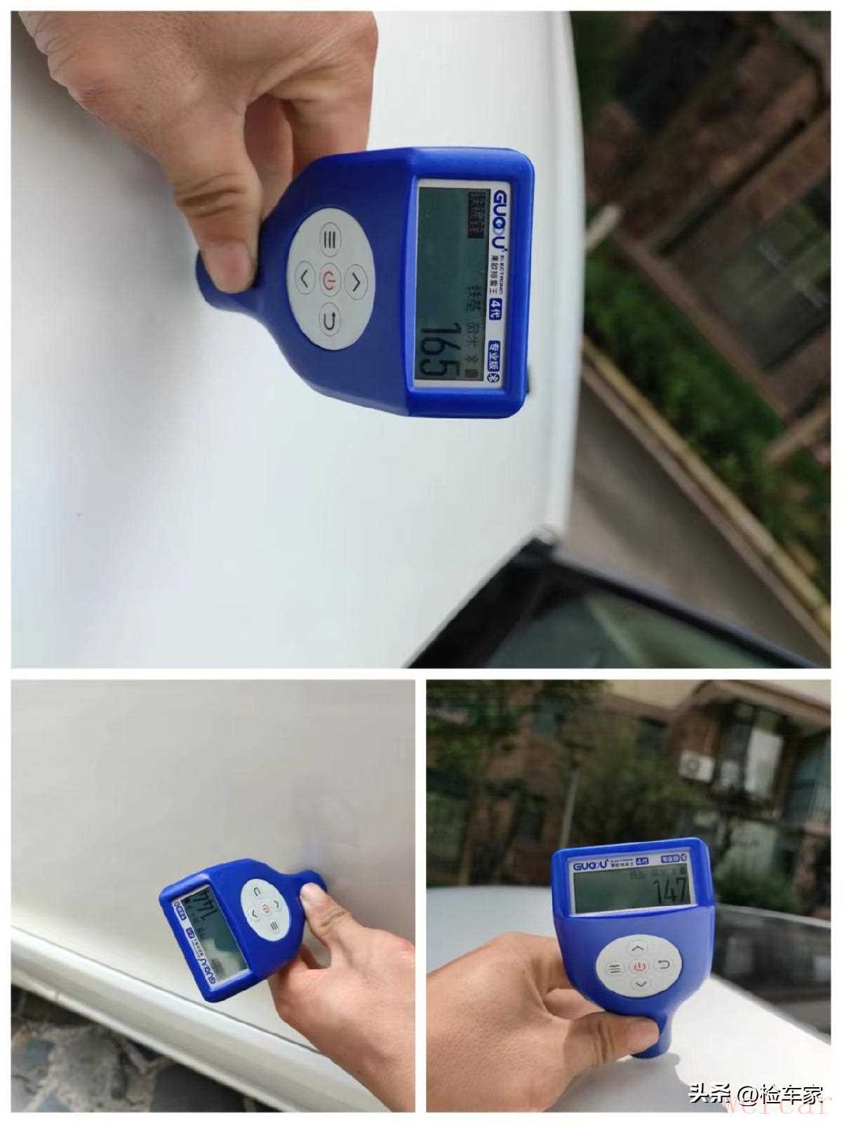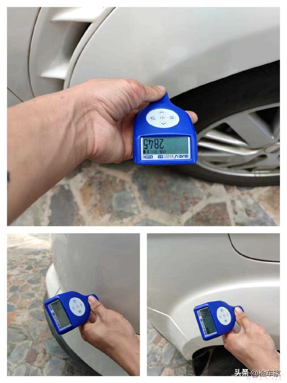 至于值不值这个价,我们就直接上正片开始检测吧。首先我们还是先从车辆的外观入手,而且按照粉丝要求,先把结构件的问题排除,首先看到检测车辆外观漆,仔细的同学已经发现漆膜仪的基数值高低不一,这是因为这辆车喷了全车漆,从大本的变更颜色能看到,原车为银色,而变更后才是白色,漆膜仪打出来的数值高低不一,那肯定喷过不止一次了。