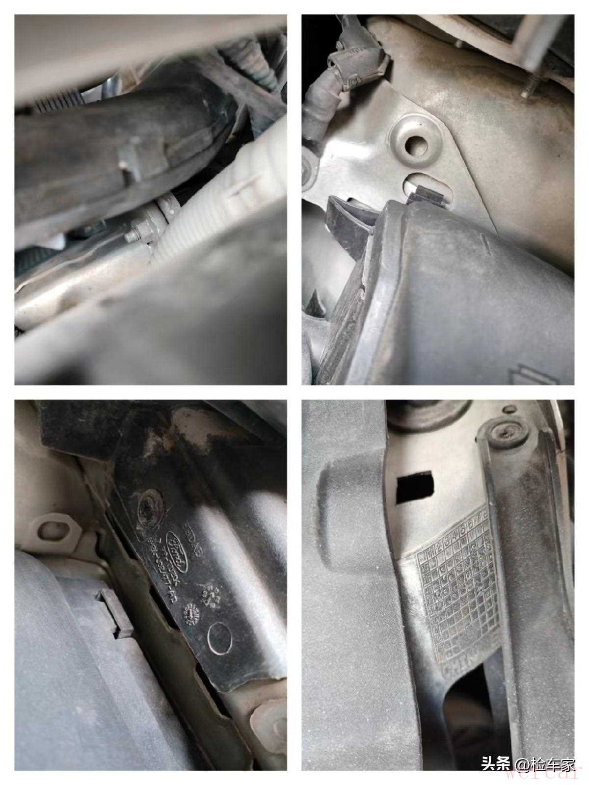 接着我们转到车辆的前部,看看车辆的纵梁部分是否存在变形的情况,这里可以看到纵梁部分还是比较规整的,并未发现有明显的变形情况。防撞梁螺丝安然无恙,水箱框架螺丝正常,生产日期符合车辆出厂日期,翼子板骨架附近的附件日期也符合车辆出厂日期,排除车头有过事故的嫌疑。
