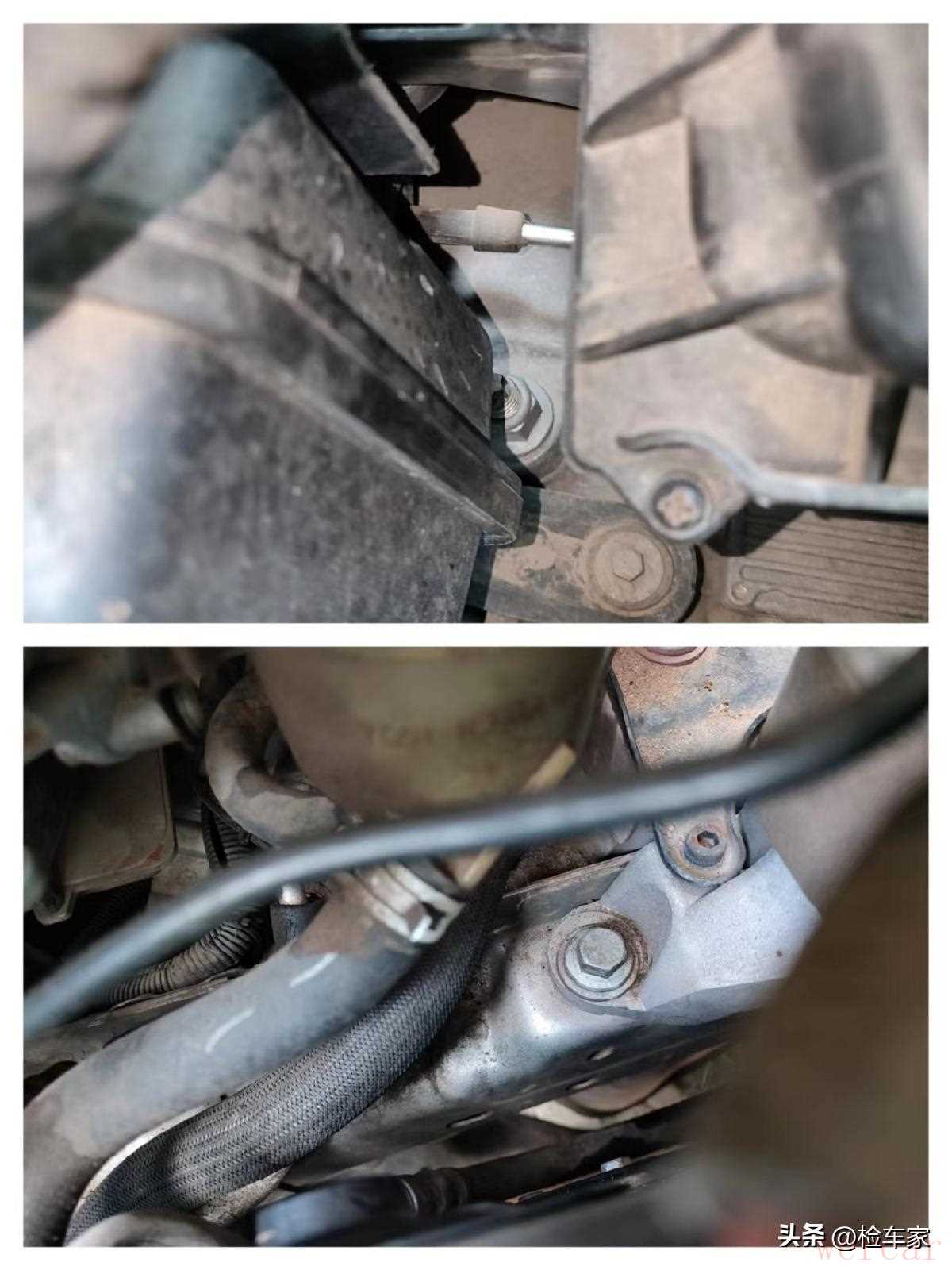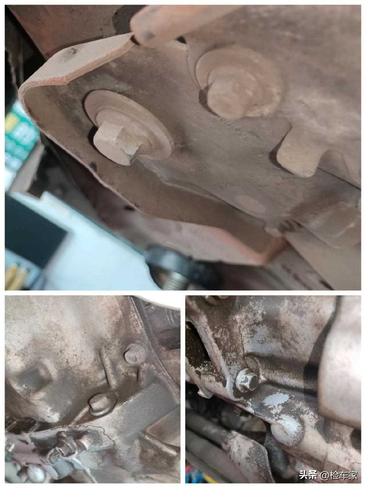 检测来到发动机,可以清晰地看到发动机的后端螺栓没有拆装痕迹,元宝梁螺丝也是纹丝未动,固然排除发动机有过吊装分解维修的可能,曲轴后油封存在渗漏油,毕竟十多年的老车了。