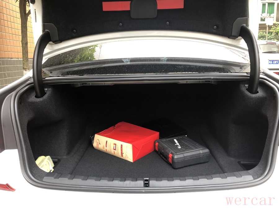 尾箱内,比起上一代来说,挂钩也没有了,网兜也没有了,板子下面是电瓶,有点越来越抠门了。