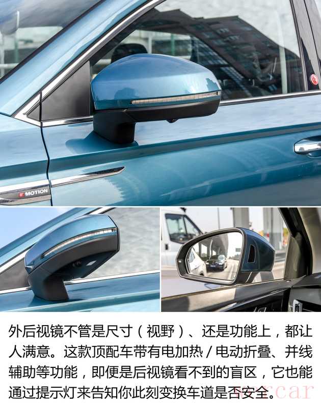 "实用性考量":配备的全景天窗(部分车型)不仅提升了采光和乘坐舒适度,也增加了车内的时尚感。外后视镜采用电动调节、加热功能,并且带防眩目功能,这对于日常