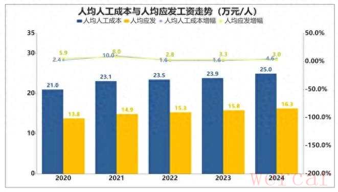 其中,2024年整体人员总量大幅下降,人工成本总额略降,人均人工成本同比增长4.6%,行业人均人工成本为25万元/人;2024年行业人均工资16.3万元/人。