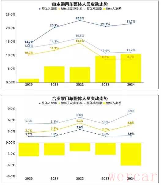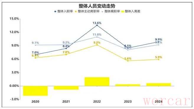 报告还指出,在人员变动方面,2024年自主乘用车板块呈现大幅流入态势:入职率为21.7%、离职率为11.2%,主要体现在研发、销售、生产专业。而合资乘用车板块呈现流出态势进一步扩大:入职率为1.9%、离职率为7.9%。