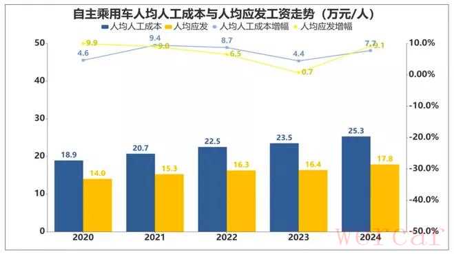而人均工资方面,2024年自主乘用车板块首次超过合资乘用车板块,自主乘用车板块为17.8万元/人,同比增长7.7%,而合资乘用车板块人均工资为17.4万元/人,同比下降1.0%。