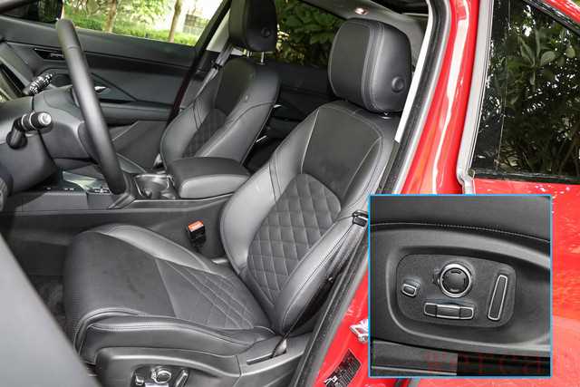 这款顶配车型采用全真皮材质包裹,前排带有座椅加热,填充物扎实,坐感偏硬,但绝不会让你感到不舒服,这也侧面印证了它的年轻运动定位。前排两个座椅均支持10向电动调节,并附加4向电动腰靠调节,副驾人员同样能享受奢侈待遇。