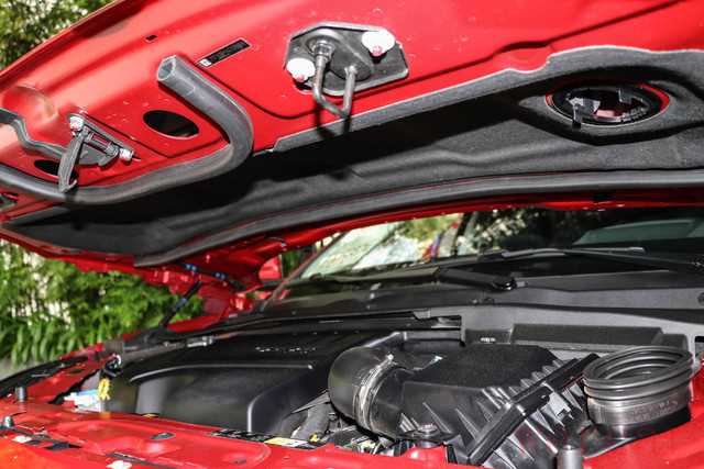 发动机的进气口有些另类,我是第一次见到这种设计,空气先通过前脸中网的初段进气口,先上升经过引擎盖走一圈,再下到空滤,这对涉水深度并没什么提升,也许是为了减少机仓内的所占空间,也许是为了让进气先在引擎盖经过预热,提高进气温度,从而提高燃烧效率,后者猜想比较靠谱。