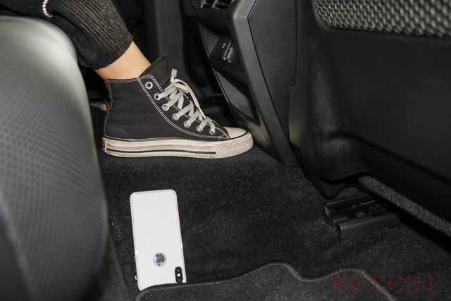 不过中央地板凸起较高,图中为36码的鞋,可以看出中央通道宽度一般,如果后排同时乘坐3个成年人,中间的乘客只能劈腿了。
