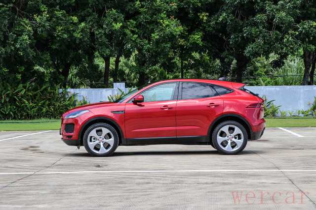 车顶完全是跑车的弧线设计,深邃的腰线如刀锋一般,它的设计师曾设计过捷豹F-TYPE,所以你在E-PACE上可以看到很多跑车的元素,这也正是它主张的年轻运动定位。