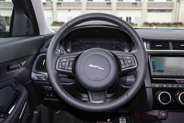 标准的捷豹方向盘样式,最大特点是带有立体感的多功能按键,在你全身心享受驾驶时,减少误操作。支持液晶仪表盘控制、自适应巡航、最高限速设置。而海外版车型的换挡拨片被取消了。