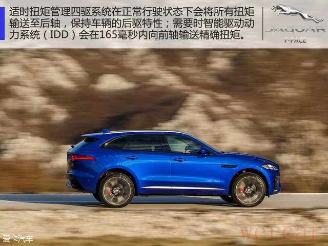 F-PACE搭载的适时扭矩管理四驱系统在正常行驶状态下会将所有扭矩输送至后轴,保持车辆的后驱特性;高速过弯时智能驱动动力系统(IDD)会在165毫秒内向前轴输送精确扭矩,确保车辆安全平稳通过。