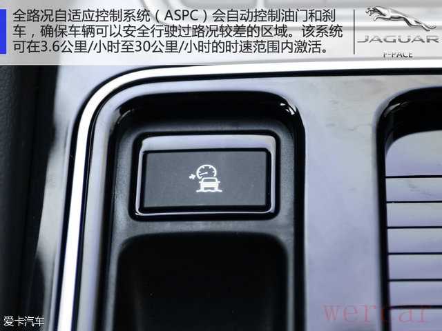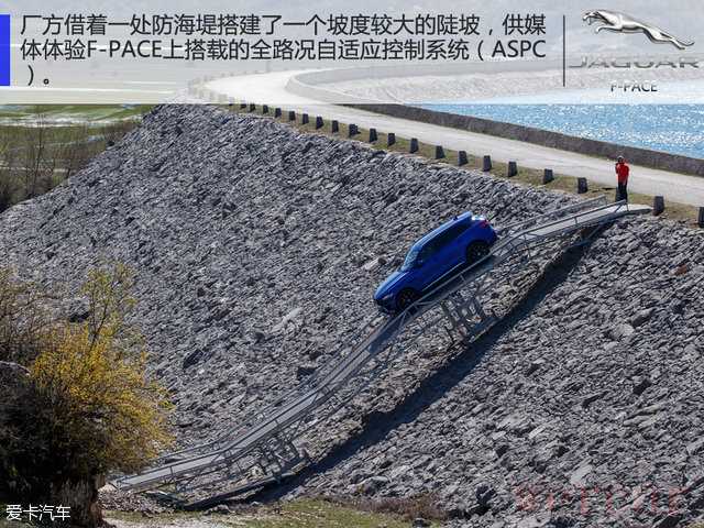 此次试驾活动虽然厂方并没有安排系统的越野测试项目,但还是颇有巧思的借着一处防海堤搭建了一个坡度较大的陡坡,供我们体验F-PACE上搭载的全路况自适应控制系统(ASPC)。这套系统会自动控制油门和刹车,确保车辆可以安全行驶过路况较差的区域。该系统可在3.6公里/小时至30公里/小时的时速范围内激活,此时驾驶者只需要控制住方向盘即可。