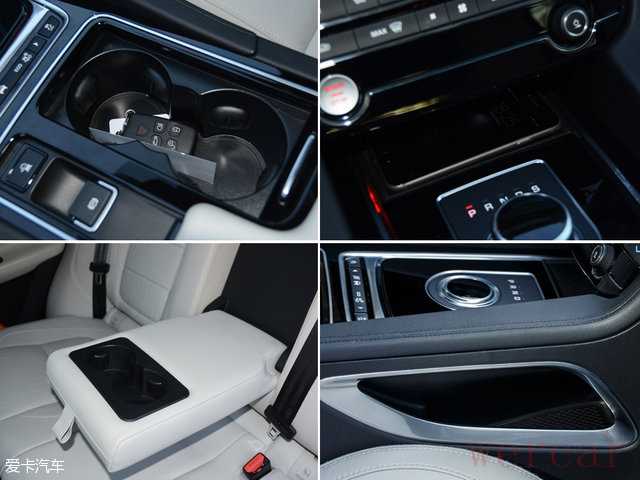 F-PACE提供了相当丰富实用的储物空间,包括前后车门内侧储物槽、前后排杯架、中控下方及地台两侧储物格等。手套箱和中央扶手箱容积也比较可观,中央扶手箱内还提供一个12伏的插座和两个USB接口。