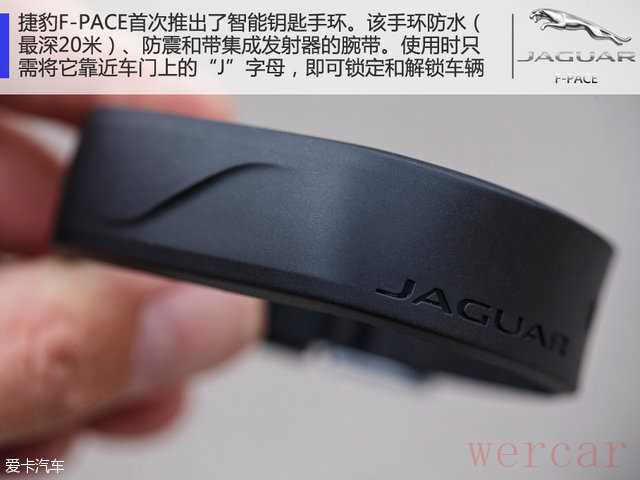 捷豹还为F-PACE首次推出了全新智能钥匙手环。这是一款防水、防震和带集成发射器的腕带。使用时只需将它靠近捷豹车门上的“J”字母,即可锁定和解锁车辆。该智能钥匙手环无需电池。