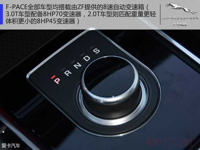 F-PACE全部车型均搭载由ZF提供的8速自动变速箱(3.0T车型配备8HP70变速器,2.0T车型则匹配重量更轻体积更小的8HP45变速器)