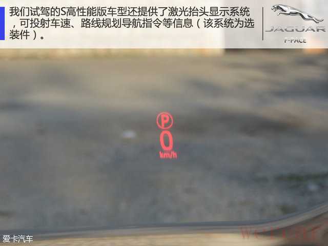 我们试驾的这台F-PACE还提供了激光抬头显示系统,可投射车速、路线规划导航指令等信息(这套系统为选装件)。
