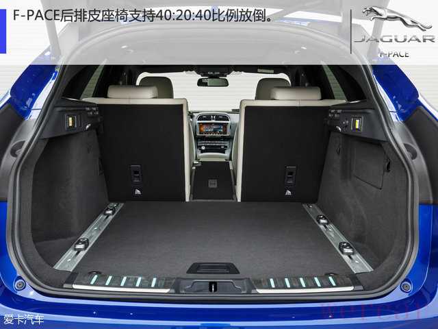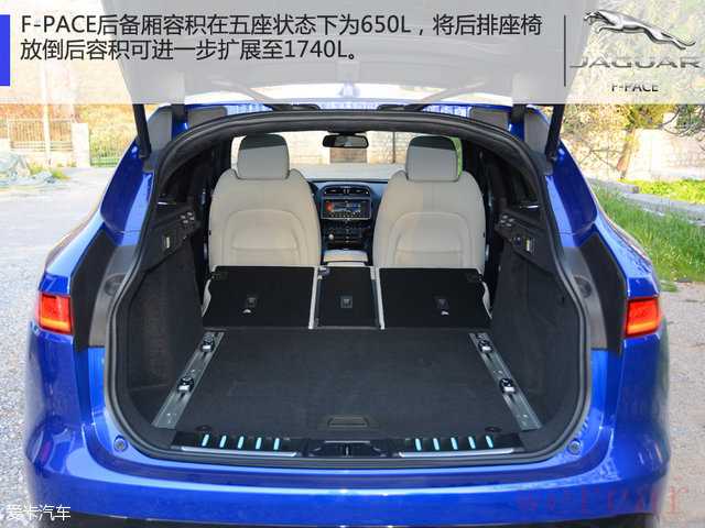F-PACE后备厢容积在五座状态下为650L,足以容纳两个全尺寸的高尔夫球袋,将后排座椅放倒后容积可进一步扩展至1740L。后备厢地板可以打开,其隔板一面为植绒材质,另一面为橡胶材质。轻量化尾门可选装感应式电动开启/关闭功能。