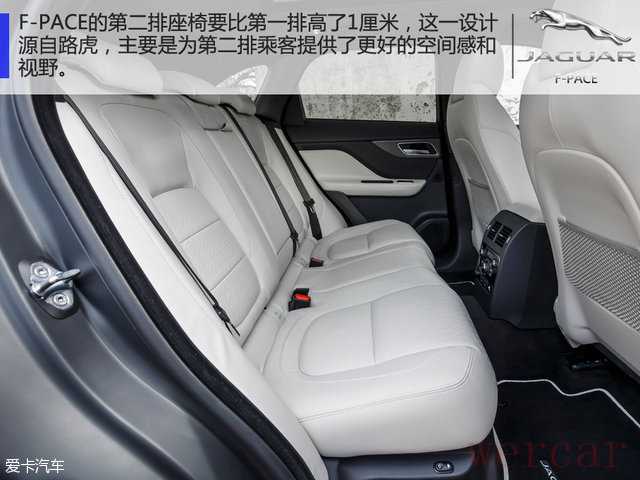 F-PACE的第二排座椅要比第一排高了1厘米,这一设计源自路虎,主要是为第二排乘客提供了更好的空间感和视野。