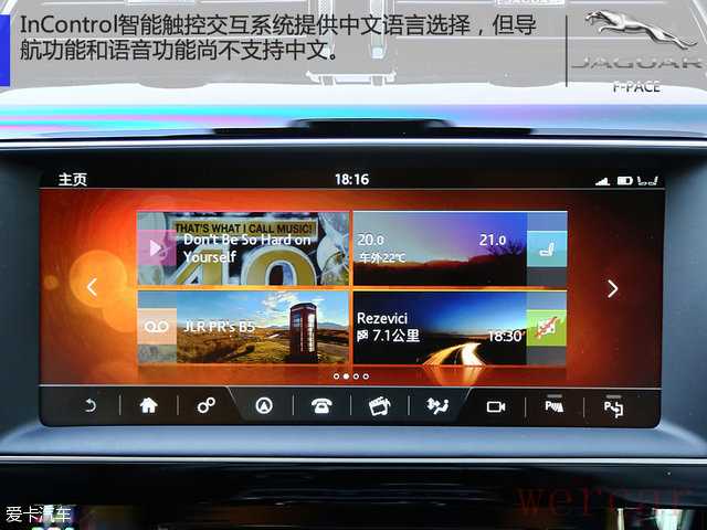 InControl智能触控交互系统也支持与安卓或苹果系统手机互联,之后驾乘者即可通过中控大屏使用手机上的应用程序。F-PACE车主还可以通过InControl远程应用程序实现对车辆的远程控制及监控,包括显示远程车辆是否已锁、车窗开关、油量、车辆停放地点、玻璃水存量、也可实现远程解锁/锁车、开启空调等功能。